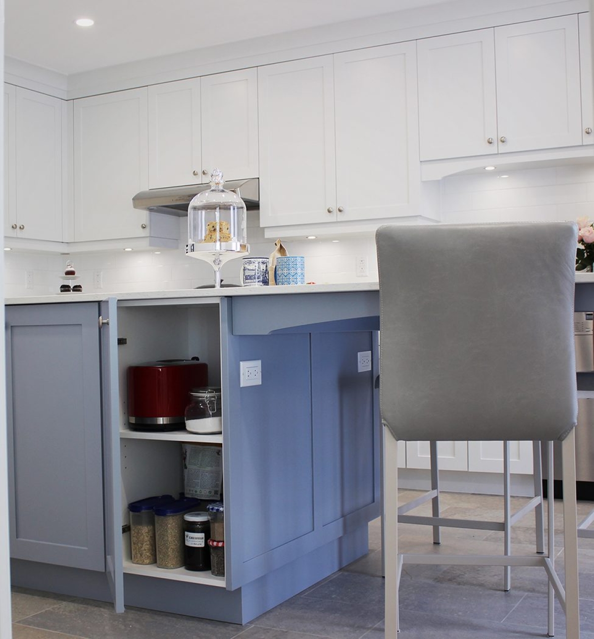 Armoire de cuisine en laque grise 2 tons et comptoir de porcelaine fini satin