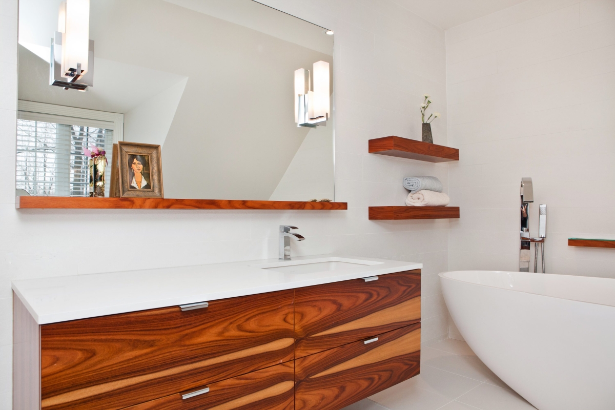 Une belle salle de bain moderne et épurée. Meubles en placage de Rosewood véritable vernis naturel